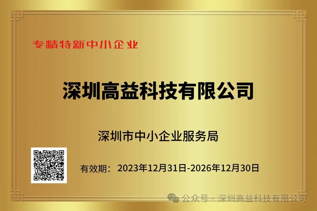 高益科技-凭借专业的研发和服务队伍、健全的管理体系,良好的创新机制,顺利通过企业自评、深圳市初审、国家部委的复核等程序,最终荣获 “专精特新企业” 、“高新技术企业”、“创新型中小企业”多项荣誉称号。荣誉的获取,是对高益科技创新能力、技术研发实力及行业专业化程度等方面的高度认可,更是对公司创新发展成就的再次肯定,标志着高益科技在专业领域的技术创新发展方面又迈入了一个更高的新台阶。