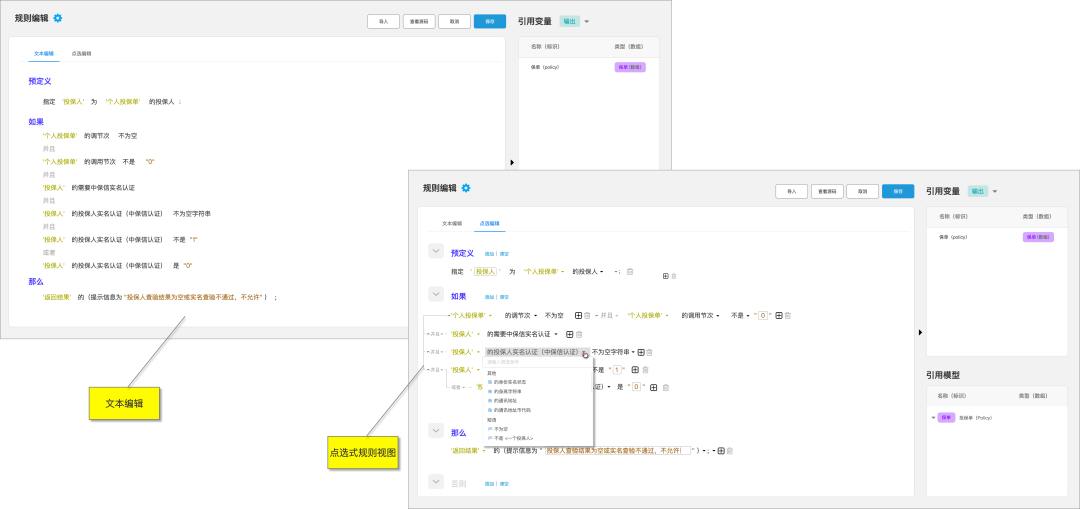 *点选式的规则编辑器。规则本身并非纯文本