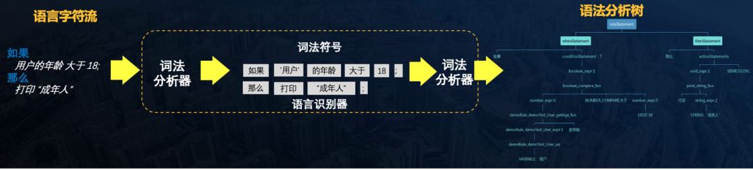 为了将自然语言的文本规则能够翻译为可执行的规则脚本,我们独创一套具备扩展性的词法、语法分析器。采用词法分析+语法分析进行规则文本解析,实现了基于文本编辑的NLP规则语法解析,为每套规则形成独立的DSL(领域模型语言)规范,灵活贴近真实业务场景。